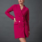 Pink Double Breasted Blazer Dress, in Karera Knit fabric, Unlined, Above Knee, Slim Fit, Button Closure, Straight Hemline and features Constrast Tipping Detail At Collar