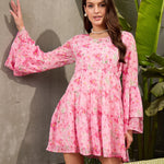 Pink Floral Back Smocked Short Dress, in Georgette fabric, Poly Knit Lining, Above Knee, Fit & Flare, Tie Closure, Flared Hemline and features Tie Detail At Back
