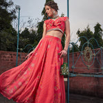 Pink Floral Frill Neck Crop Top With Anarkali Skirt , in Georgette fabric, Butter Crepe Lining, Crop Length , Fit & Flare, Zipper Closure, Straight Hemline and features Frill Detail At Top