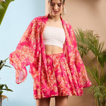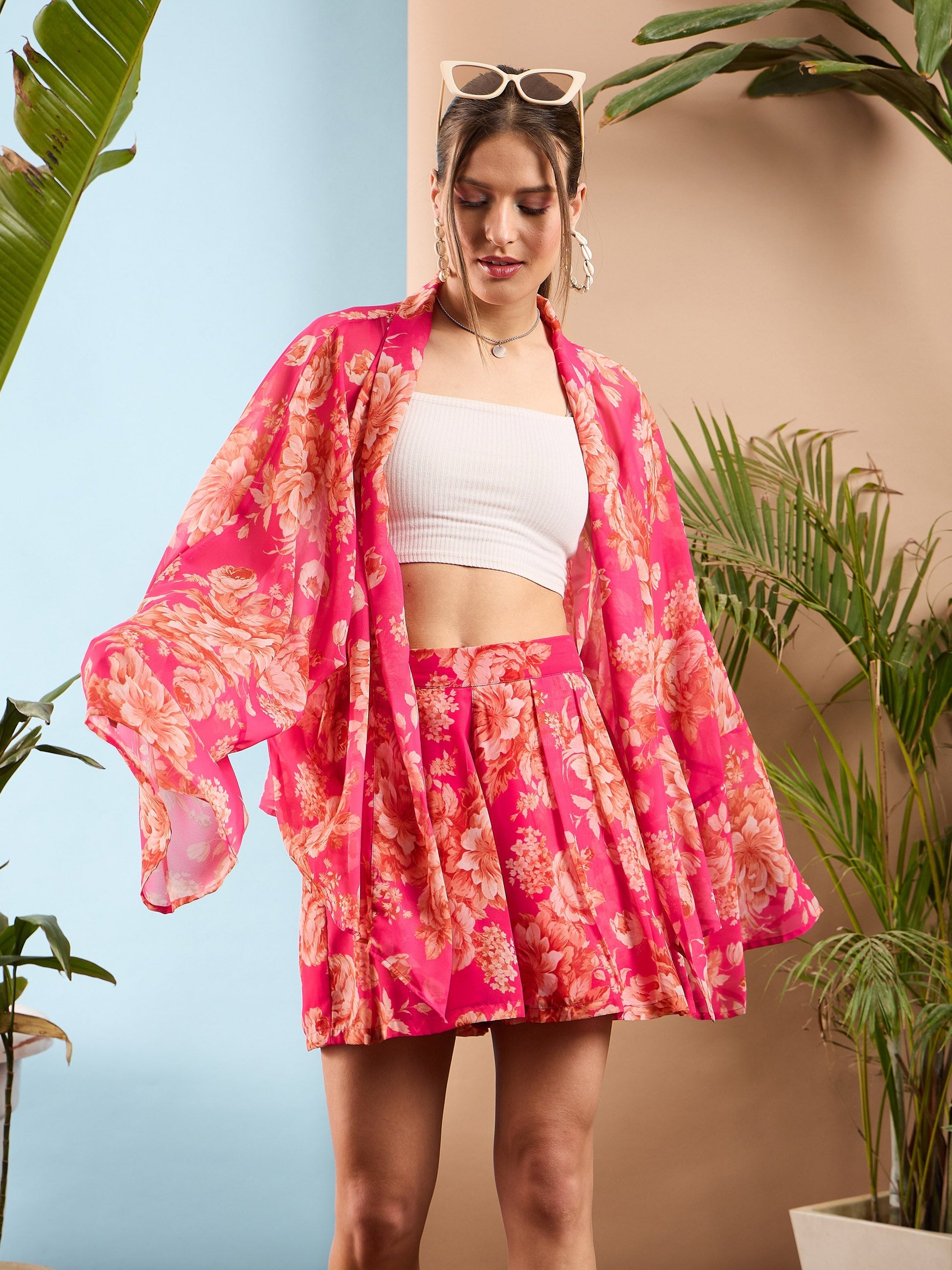Pink Floral Front Open Kimono Shrug, in Georgette fabric, NA, Regular Length, Loose Fit, NA, Straight Hemline and features Kimono Sleeves