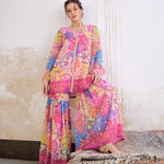 Pink Floral Front Placket Top With Sharara Pants, in Georgette fabric, Butter Crepe Lining, Above Knee, Comfort Fit, Hook Eye Closure, Straight Hemline and features Lace Detail At Front Placket