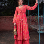 Pink Floral Front Yoke Anarkali Kurta With Palazzo Pants , in Georgette fabric, Butter Crepe Lining, Midi Length, Comfort Fit, Zipper Closure, Flared Hemline and features Dori Closure At Front