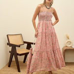 Pink Floral Strappy Smocked Maxi Dress, in Georgette fabric, Polyknit Lining, Below Knee, Fit & Flare, Slip On , Flared Hemline and features Smocking At Bust