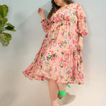 Pink Floral Tiered Midi Dress, in Georgette fabric, Poly Knit Lining, Midi Length, Comfort Fit , Drawstring Closure, Flared Hemline and features Drawstring Detail At Front