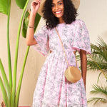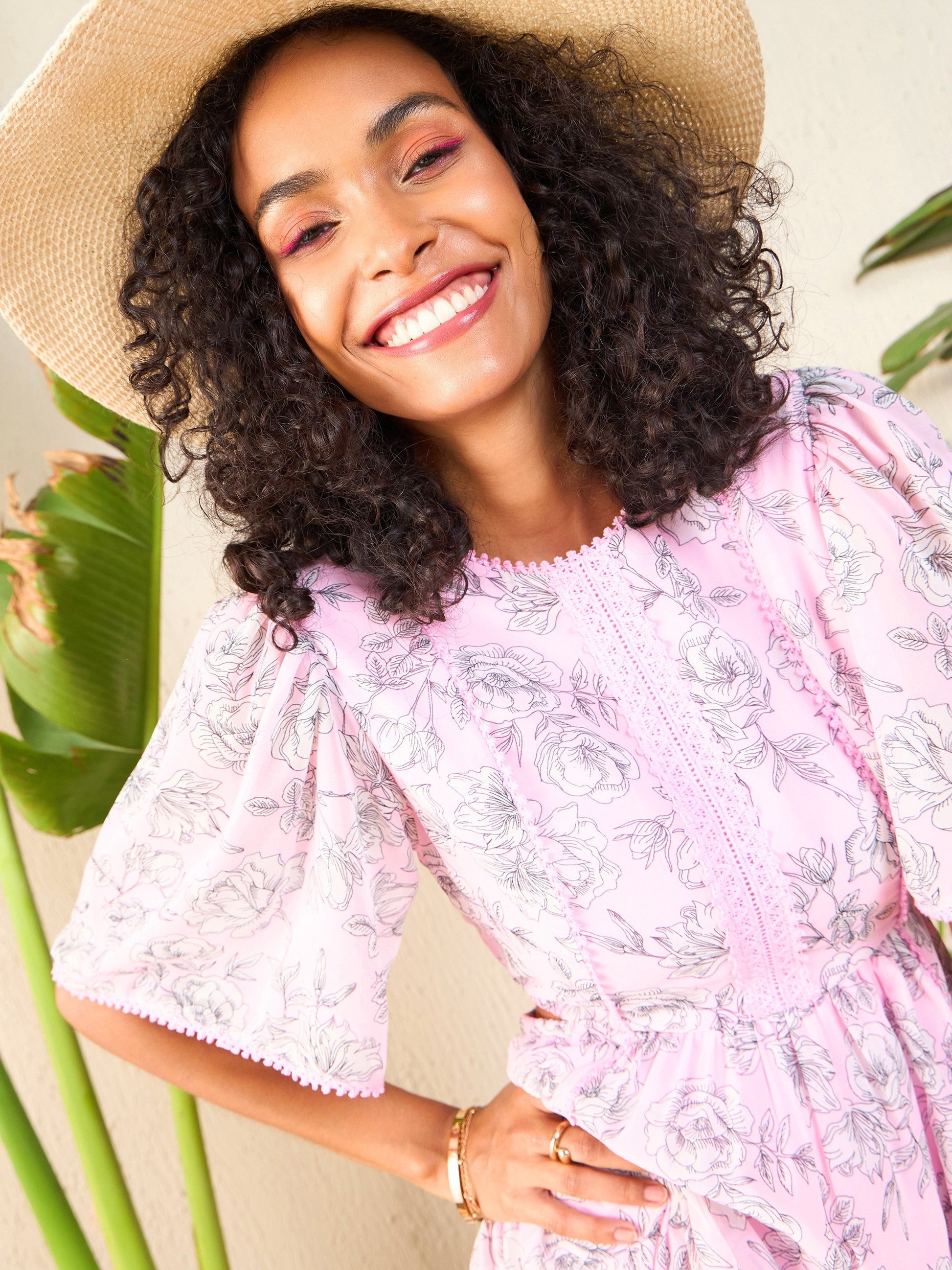 Pink Floral Waist Cut-Out Skater Dress, in Georgette fabric, Lace Detail At Front , , Woven, Flared, Fabric: Georgette Hemline and features Lace Detail At Front