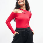 Women Pink High Neck Shoulder Cut Out Rib Top