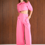 Pink Poplin Peterpan Collar Top With Flared Pants, in Poplin fabric, Unlined, Crop Length, Regualr Fit, Button Closure, Straight Hemline and features Lace Detai At Collar / Pleate At Front