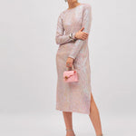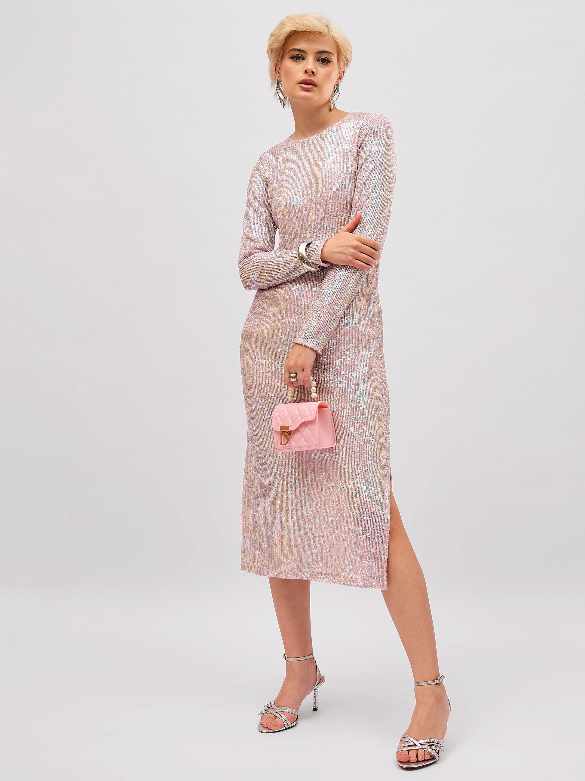 Women Pink Rainbow Sequin Round Neck Side Slit Midi Dress