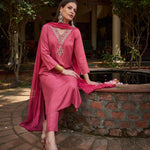 Women Pink Rayon Embroidered Kurta With Pencil Pants & Dupatta