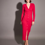 Pink Rib Front Button Midi Dress, in Rib fabric, Unlined, Midi Length, Bodycon, Button Closure, Straight Hemline and features Plastic Button Detail At Front