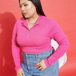 Women Pink Rib Front Zipper Top