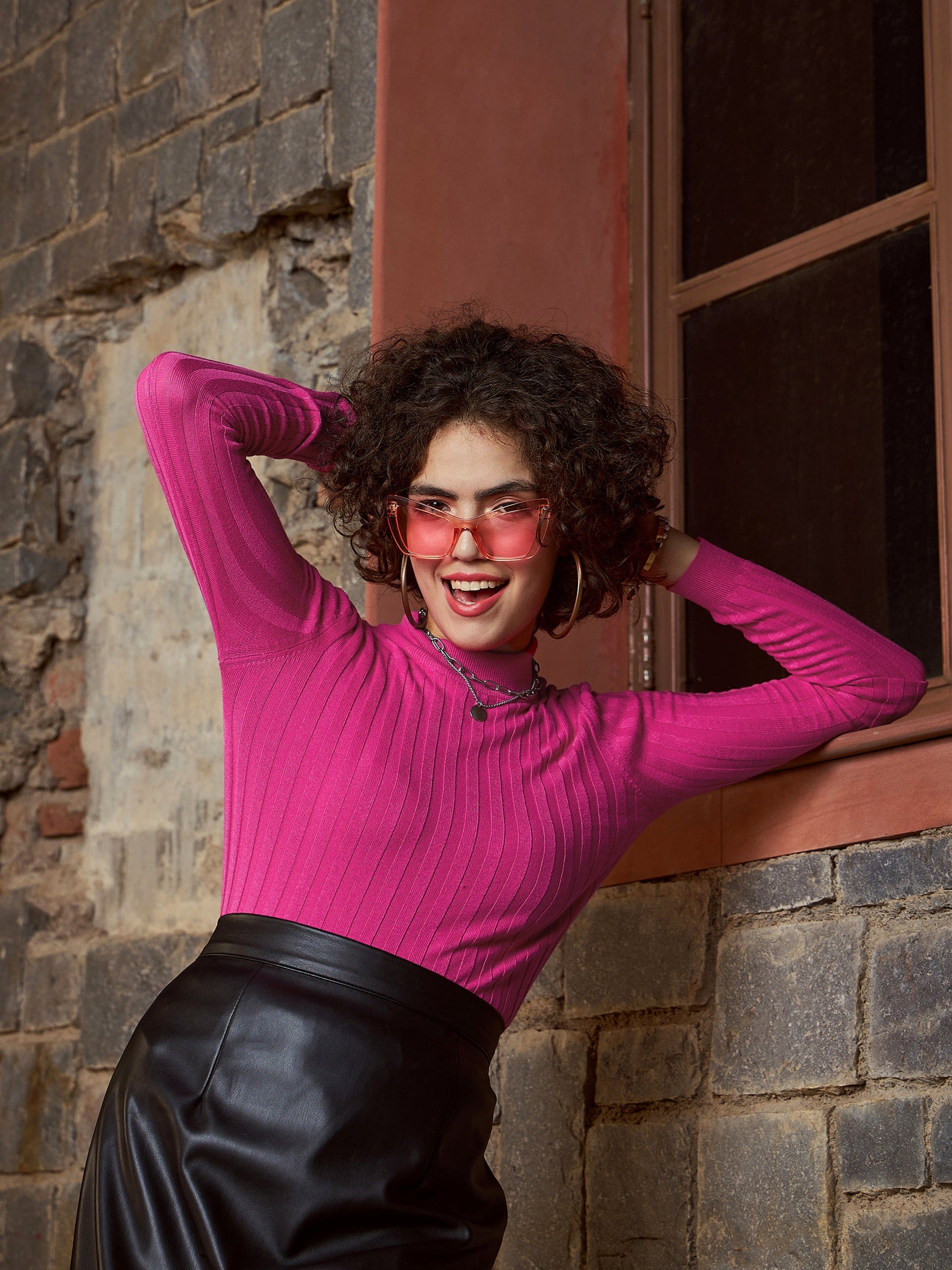 Pink Rib Full Sleeves High Neck Sweater, in Viscose Nylon Rib fabric, Unlined, Regular Length, Slim Fit, No Closure, Straight Hemline and features Self Ribbed Design