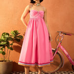 Pink Ric Rac Lace Strappy Midi Dress, in Cotton Poplin fabric, Unlined, Midi Length, Fit & Flare, No Closure, Flared Hemline and features Multi Color Ric Rac Lace Detail At Hem
