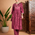 Pink Velvet Embroidered Gathered Kurta, in Velvet fabric, Unlined, Midi Length, Fit & Flare, NA, Flared Hemline and features Embroidery Detail At Front