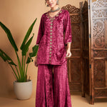 Women Pink Velvet Embroidered Short Kurta With Palazzos