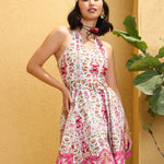 Pink & White Floral Halter Neck Short Dress, in Cotton Poplin fabric, NA, Above Knee, Fit & Flare, Tie Up Closure, Flared Hemline and features Lace Detail At Neck