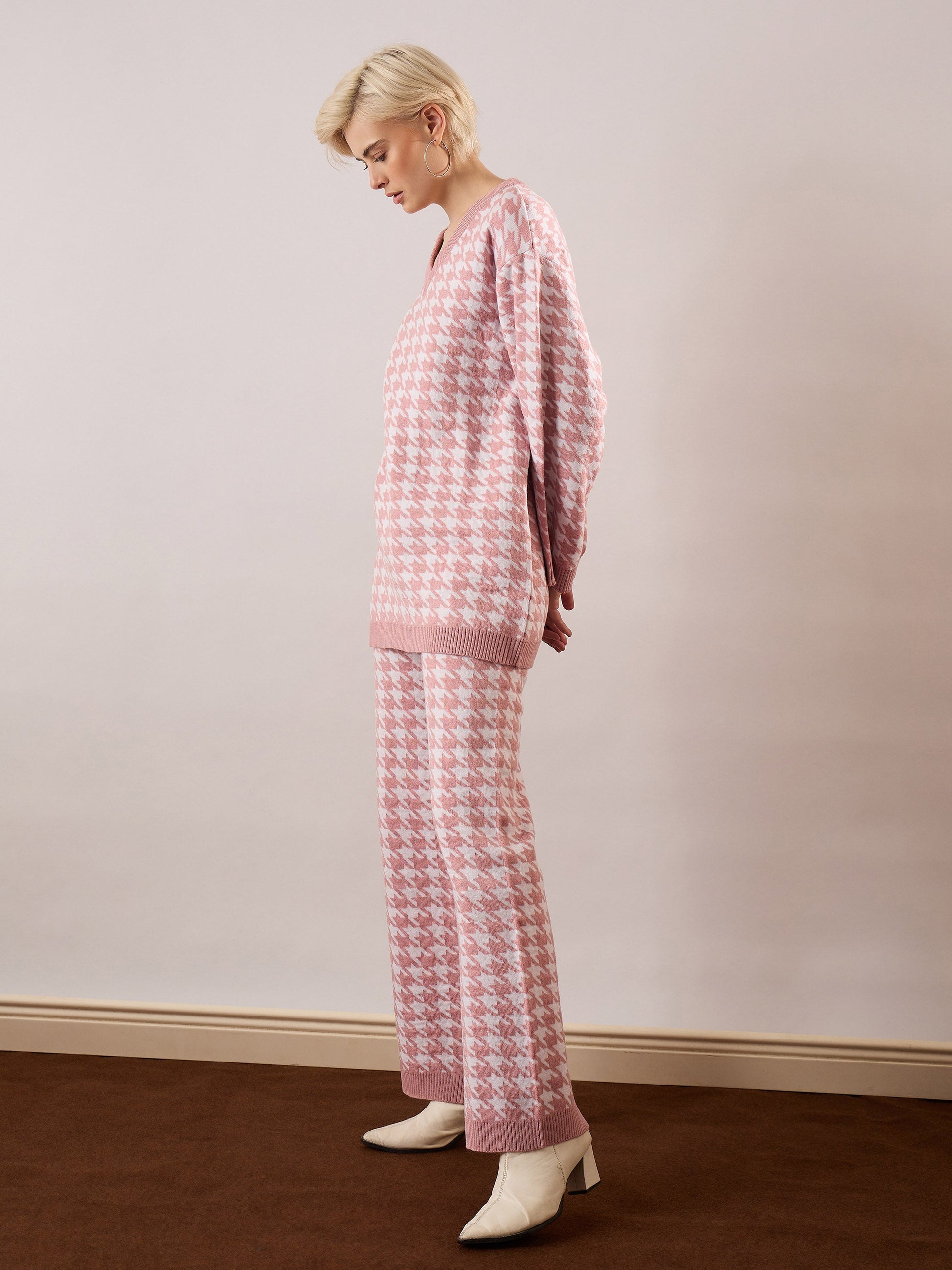 Pink & White Houndstooth V-Neck Sweater With Joggers, in Acrylic Wool fabric, Unlined, Regular length, Comfort Fit, No Closure, Straight Hemline and features Self Design / Drawstring At Waist