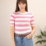Pink & White Striped Acrylic Top, in Viscose Nylon fabric, NA, Regular Length, Regular Fit, No Closure, Straight Hemline and features