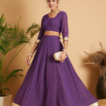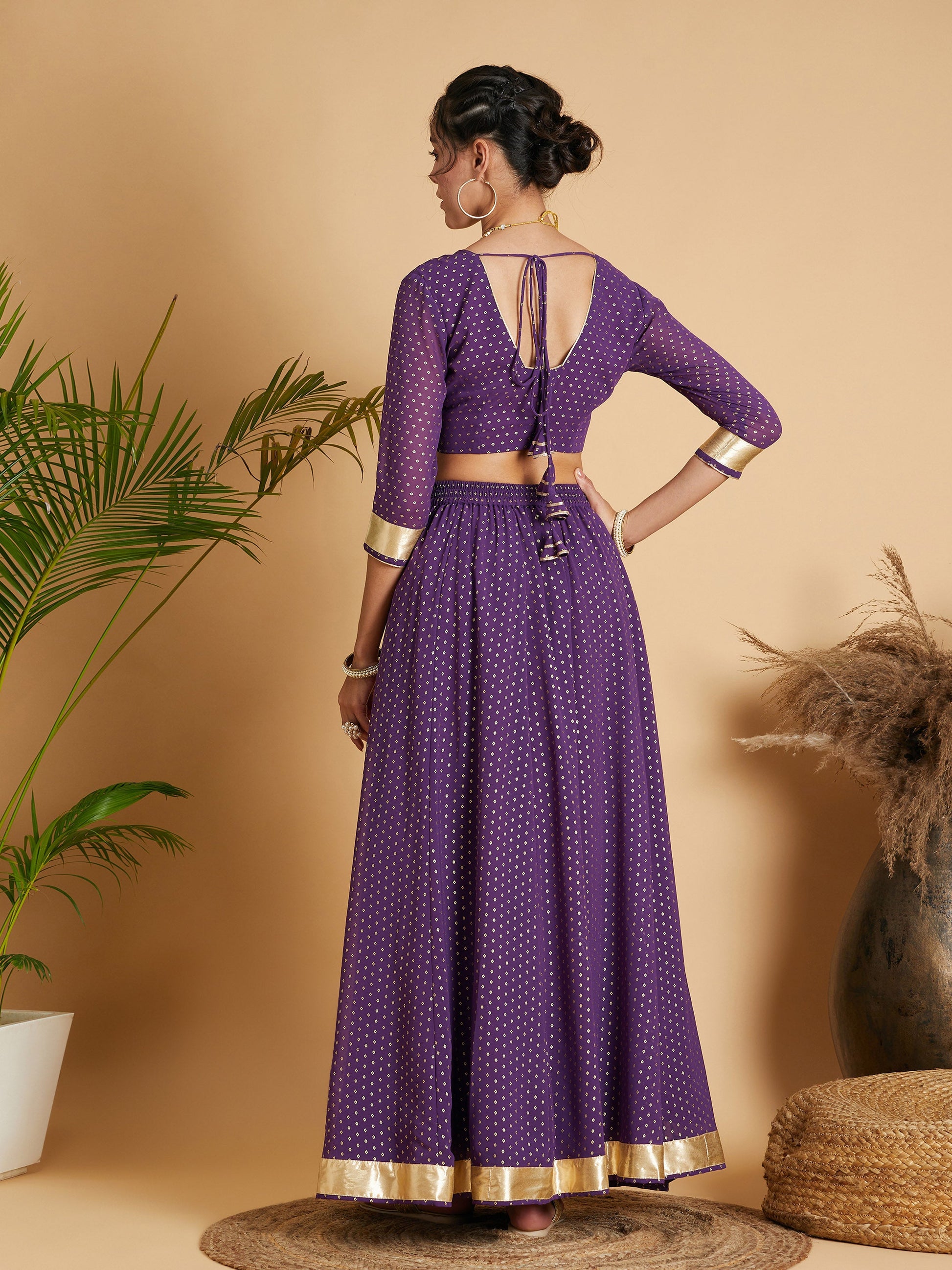 Purple Dot Foil Print Anarkali Skirt With Crop Top, in Georgette fabric, Butter Crepe Lining, Crop Length, Comfort Fit/ Fit & Flare, Zipper Closure, Straight Hemline and features Gota Lace Detail At Hem