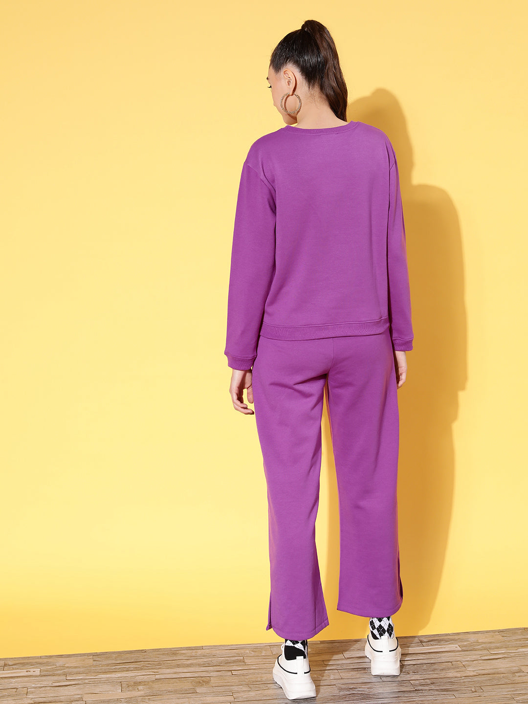 Purple Fleece JUST CHILL Sweatshirt With Track Pants, in Fleece fabric, Unlined, Regular Length/Full Length, Comfort Fit, No Closure/Elasticated Waistband, Straight Hemline and features Print At Front/Slit At Sides