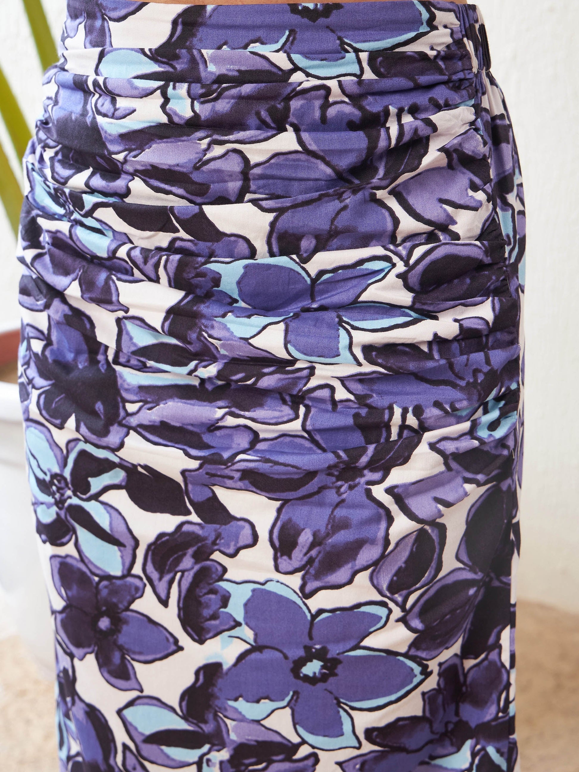 Purple Floral Crop Shirt With Side Ruched Maxi Skirt, in Poplin fabric, Cotton, Crop, Boxy Fit/ Regular Fit, Button Closure, Straight Hemline and features Plastic Button Closure /Slit At Side