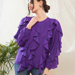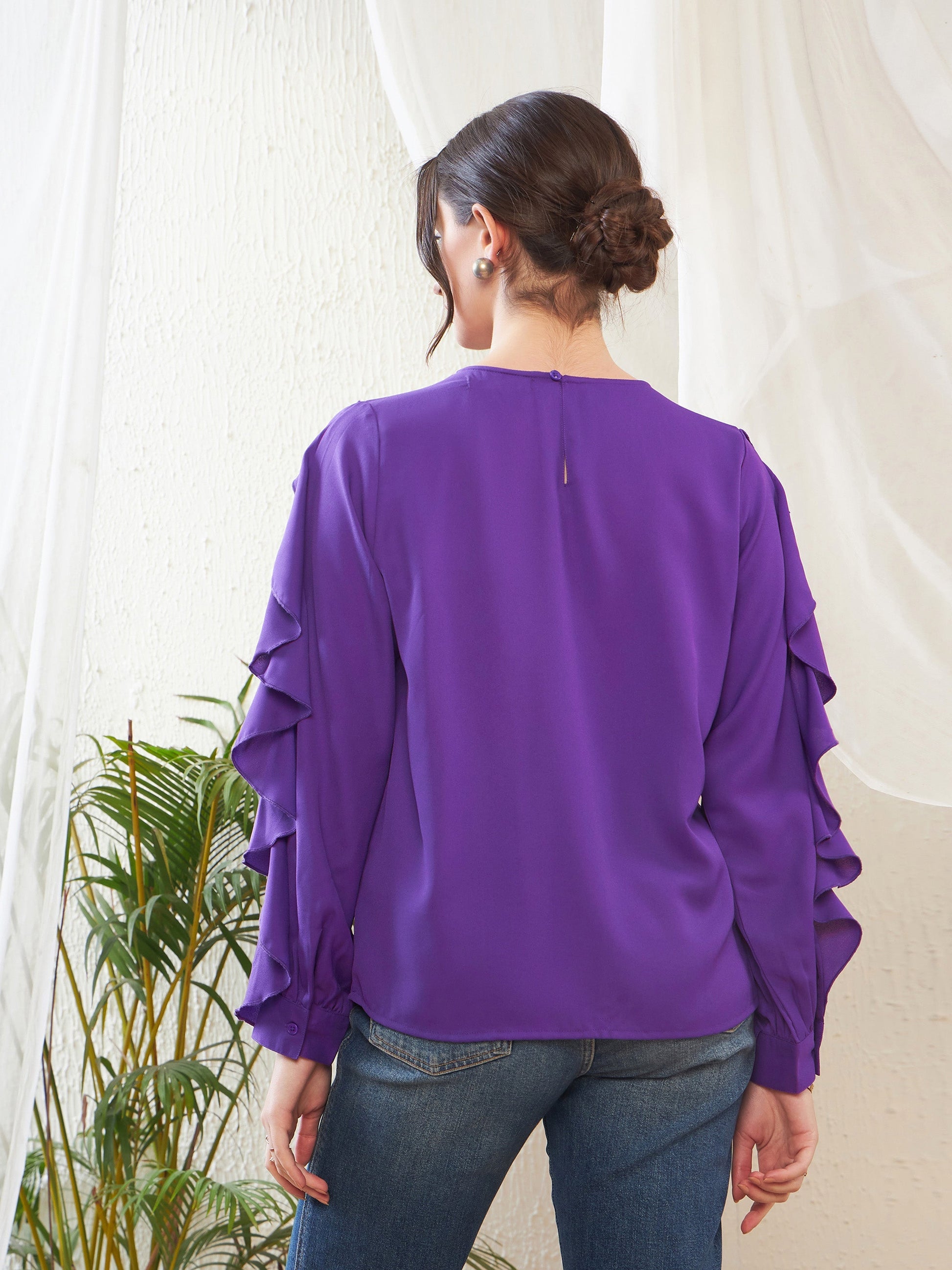 Purple Full Sleeves Ruffle Top, in Heavy Georgette fabric, Unlined, Regular Length , Regular Fit, Button Closure , Straight Hemline and features Key Hole Detail At Back