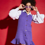 Women Purple Tweed Front Button Frill Hem Dress