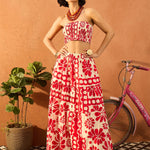 Red & Beige Floral Tube Top With Tiered Skirt, in Cotton Cambric fabric, Cotton Voile Lining, Crop Length , Fit & Flare , No Closure , Straight Hemline and features Smoking Detail At Front