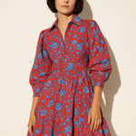 Red & Blue Floral Ruched Sleeves Short Dress, in Cotton Poplin fabric, Unlined, Above Knee, Fit & Flare, Button Closure, Flared Hemline and features Rouching Detail At Sleeves