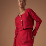 Red Check Jacquard Tweed Square Neck Top, in Tweed fabric, Polyester, Regular Length, Regular Fit, Button Closure, Straight Hemline and features Fancy Button Detail