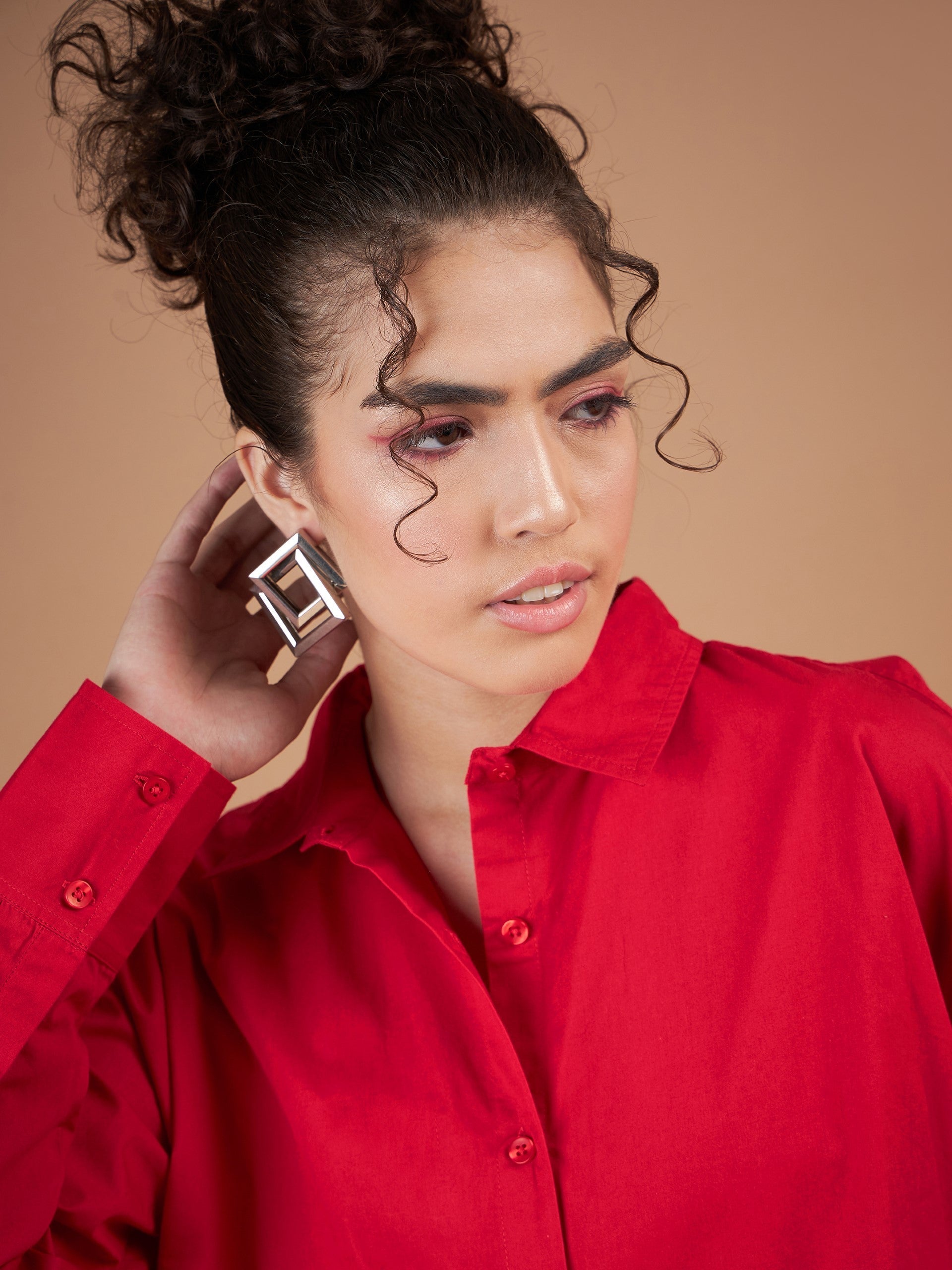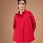 Red Cotton Poplin Oversized Shirt, in Poplin fabric, Unlined, Regular Length, Oversized, Button Closure, Curved Hemline and features Plastic Button Detail
