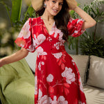 Red Floral Balloon Sleeve Short Dress, in Georgette fabric, Poly Knit Lining, Above Knee, Fit & Flare, NA, Flared Hemline and features Button Detail At Front