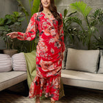 Red Floral Cowl Maxi Dress, in Georgette fabric, Poly Knit Lining, Full Length, Fit & Flare, Zipper Closure, Flared Hemline and features Frill At Hem