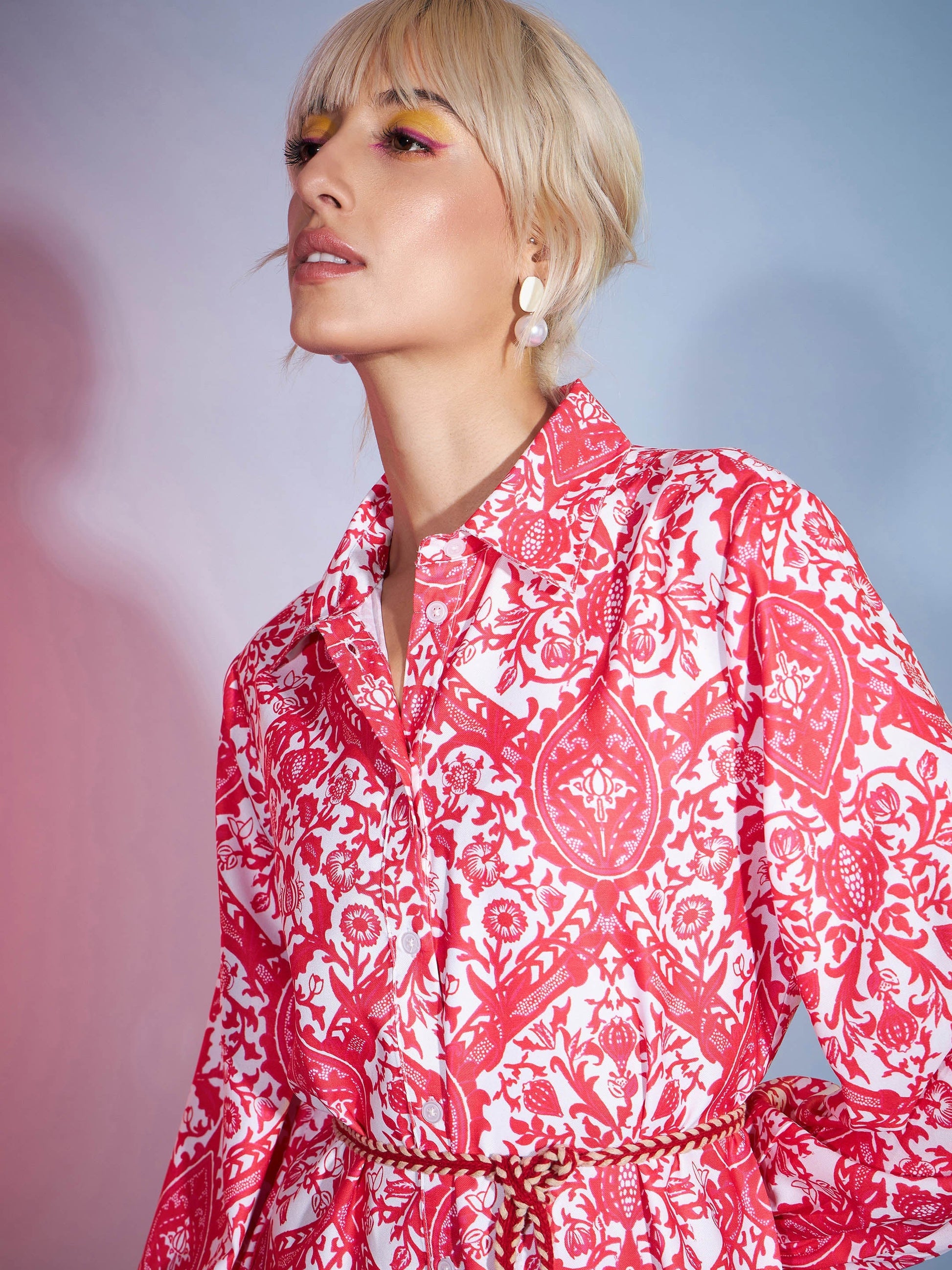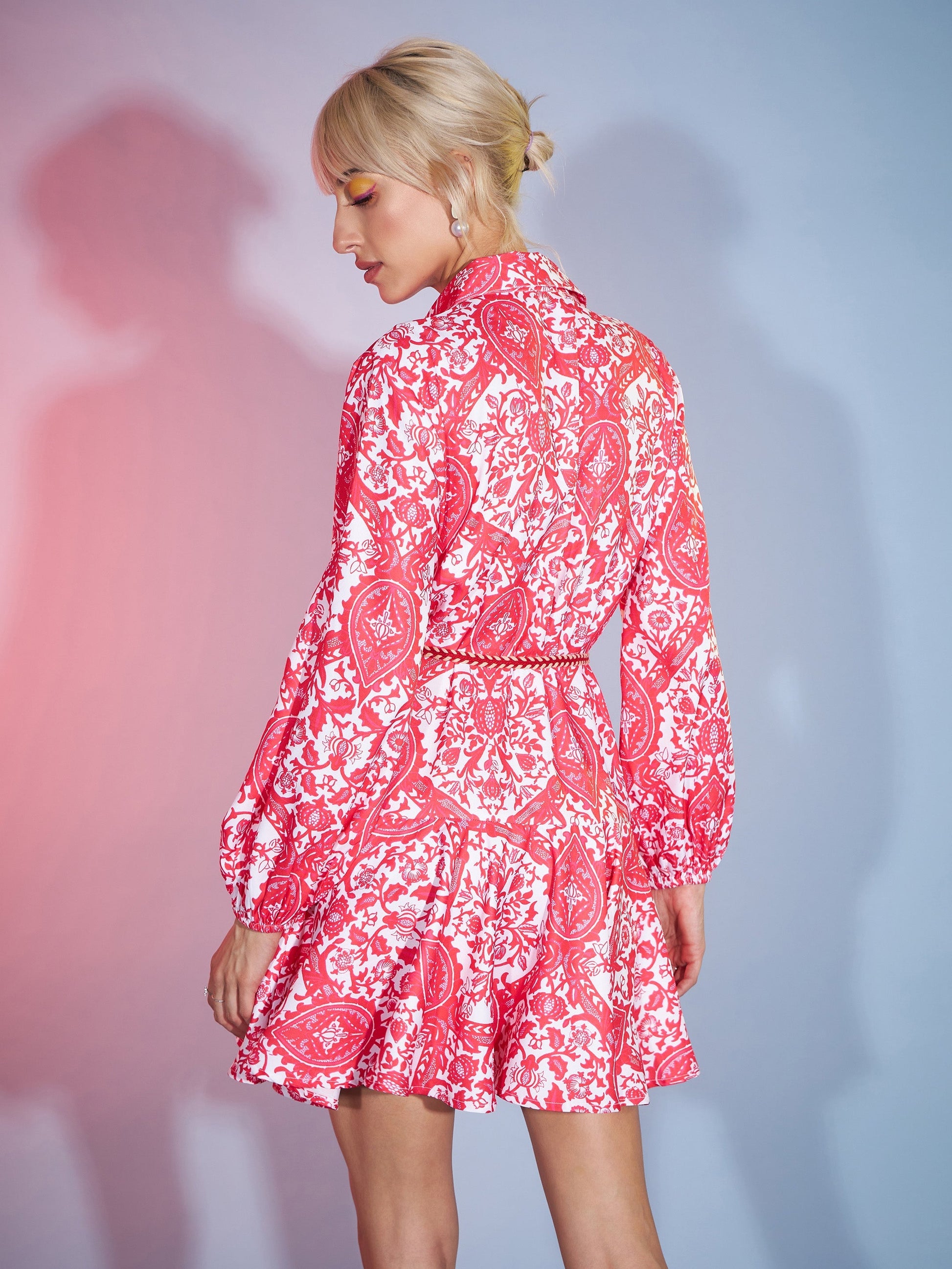 Red Floral Flared Skater Dress, in Poly Rayon fabric, NA, Above Knee, Fit & Flare, Button Closure, Flared Hemline and features Braided Belt Detail At Waist