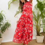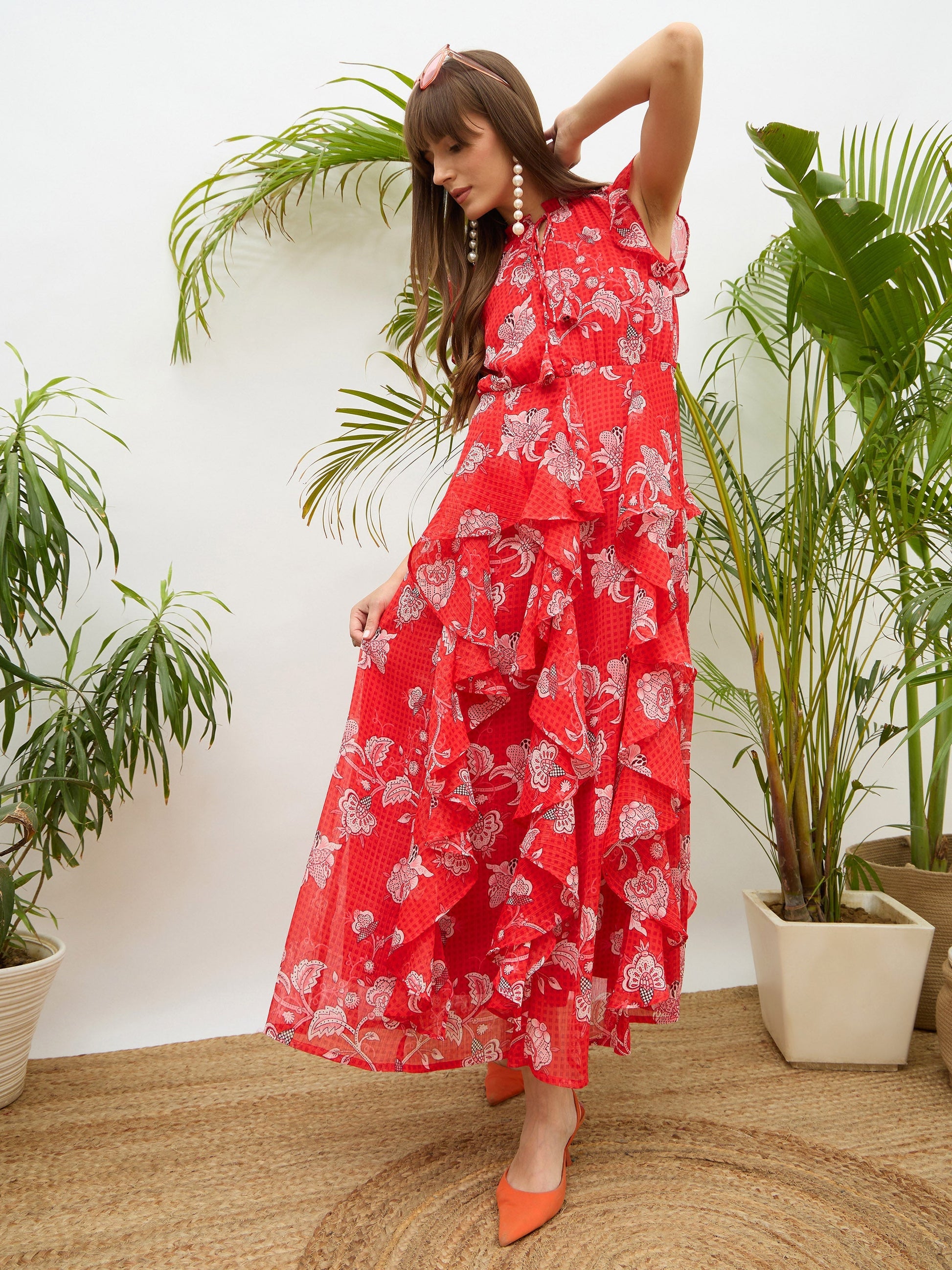 Women Red Floral Front Ruffle Detail Maxi Dress