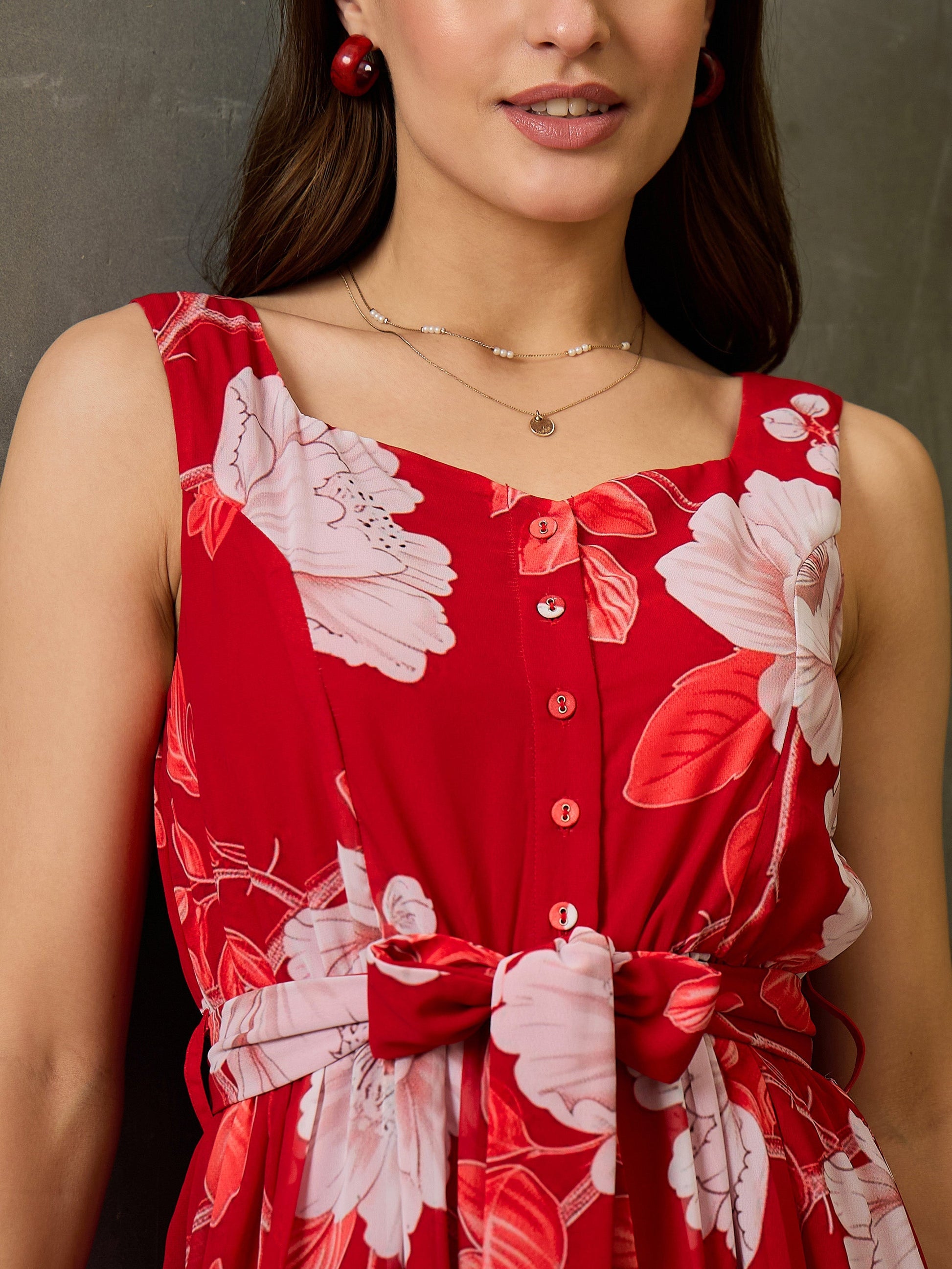 Red Floral Strappy Short Dress, in Georgette fabric, Poly Knit Lining, Short Dress, Fit & Flare, Button Closure, Flared Hemline and features Button At Front
