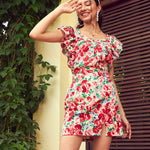 Women Red Floral Sweetheart Neck Top With Mini Skirt