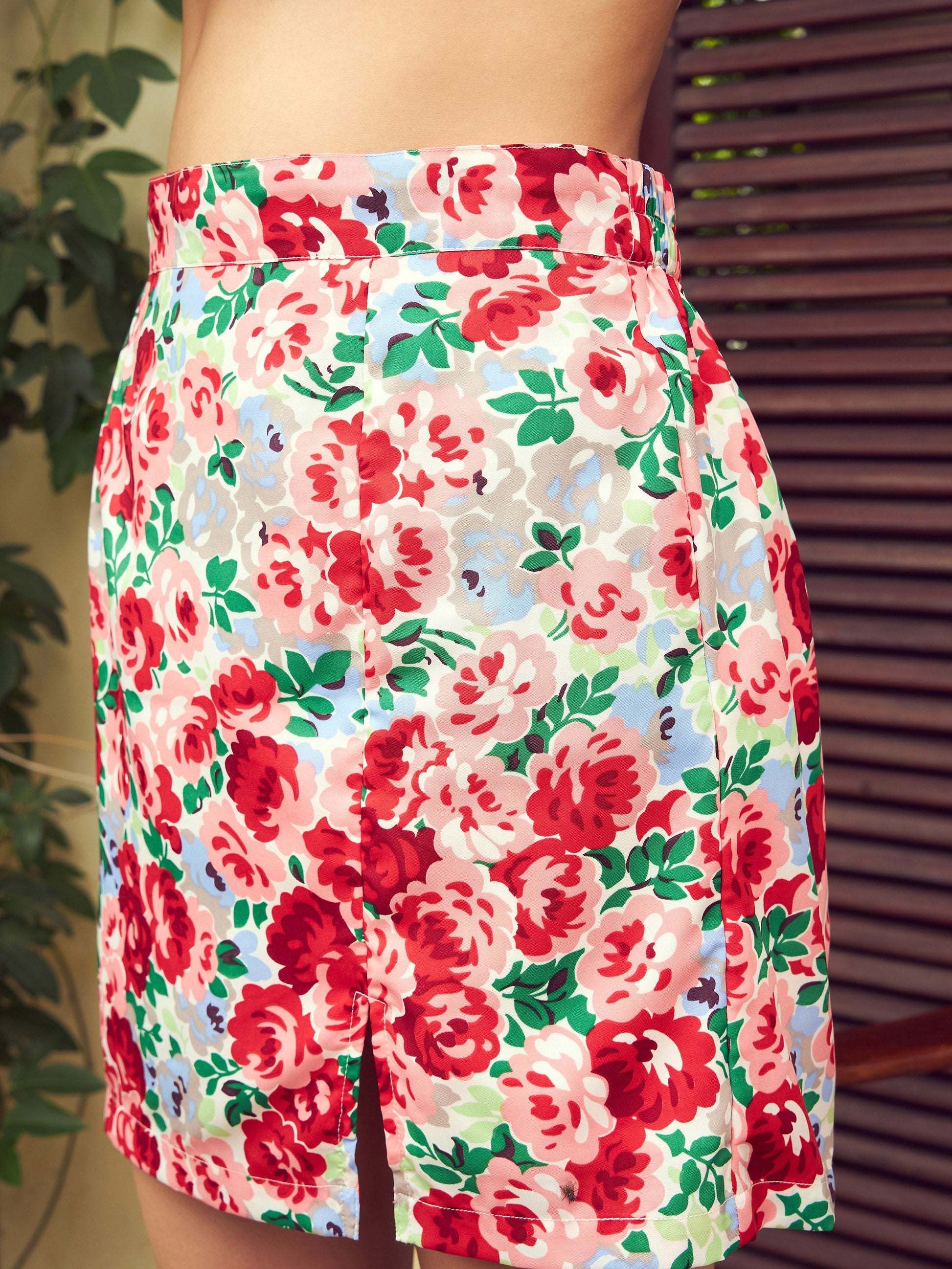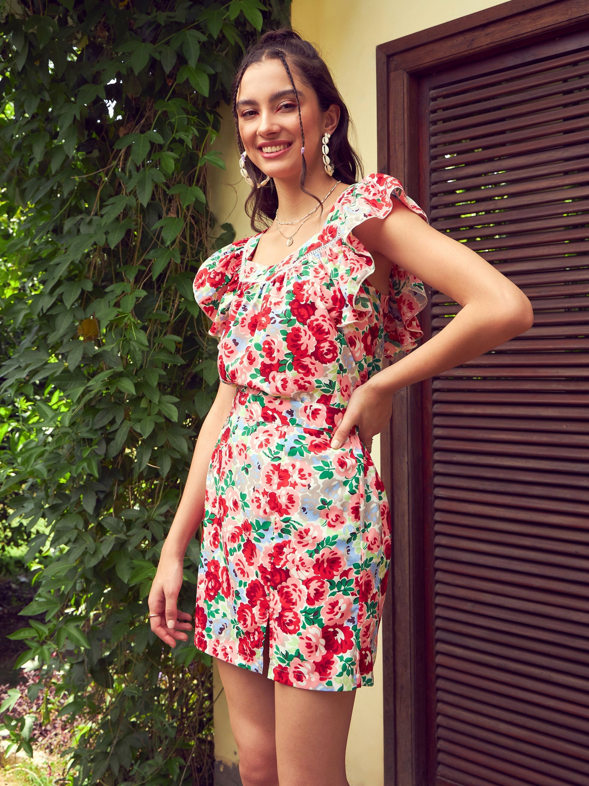 Red Floral Sweetheart Neck Top With Mini Skirt, in Poly Crepe fabric, Unlined/ Polyester, Regular Length, Comfort Fit/ Slim Fit, No Closure, Straight Hemline and features Ruffle Detail At Shoulders