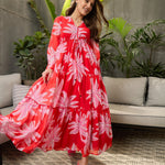 Red Floral Tiered Maxi Dress, in Georgette fabric, Poly Knit Lining, Below Knee, Fit & Flare, NA, Flared Hemline and features Tie Detail At Front