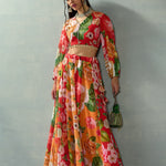 Women Red Floral V Neck Crop Top With Anarkali Skirt
