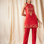 Red Foil Print Halter Neck Kurta With Pants, in Rayon fabric, Unlined, Above Knee, Straight Fit, Button Closure, Straight Hemline and features Foil Print Detail At Front