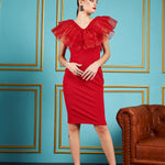 Women Red Frill Neck Bodycon Midi Dress