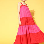 Women Red & Fuchsia Colour Block Tiered Maxi Dress