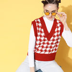 Women Red Houndstooth V-Neck Sleeveless Sweater