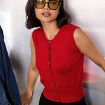 Red Kniited Round Neck Button Down Top, in Knitted Viscose fabric, Unlined, Regular Length, Comfort Fit, Button Closure, Straight Hemline and features Button At Front