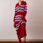 Women Red & Lavender Striped Acrylic Wool Collar Midi Dress