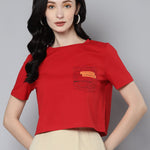 Red Newspaper Pocket Crop T-Shirt, in Jersey fabric, Unlined, Crop Length, Comfort Fit, No Closure, Straight Hemline and features Newspaper Print Pocket Detail
