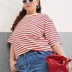 Red & Off White Stripe Round Neck T-Shirt, in Cotton Lycra fabric, Unlined, Regular Length, Comfort Fit, No Closure, Straight Hemline and features Rib Detail At Neck