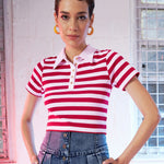 Women Red & Pink Stripes Crop Polo T-Shirt