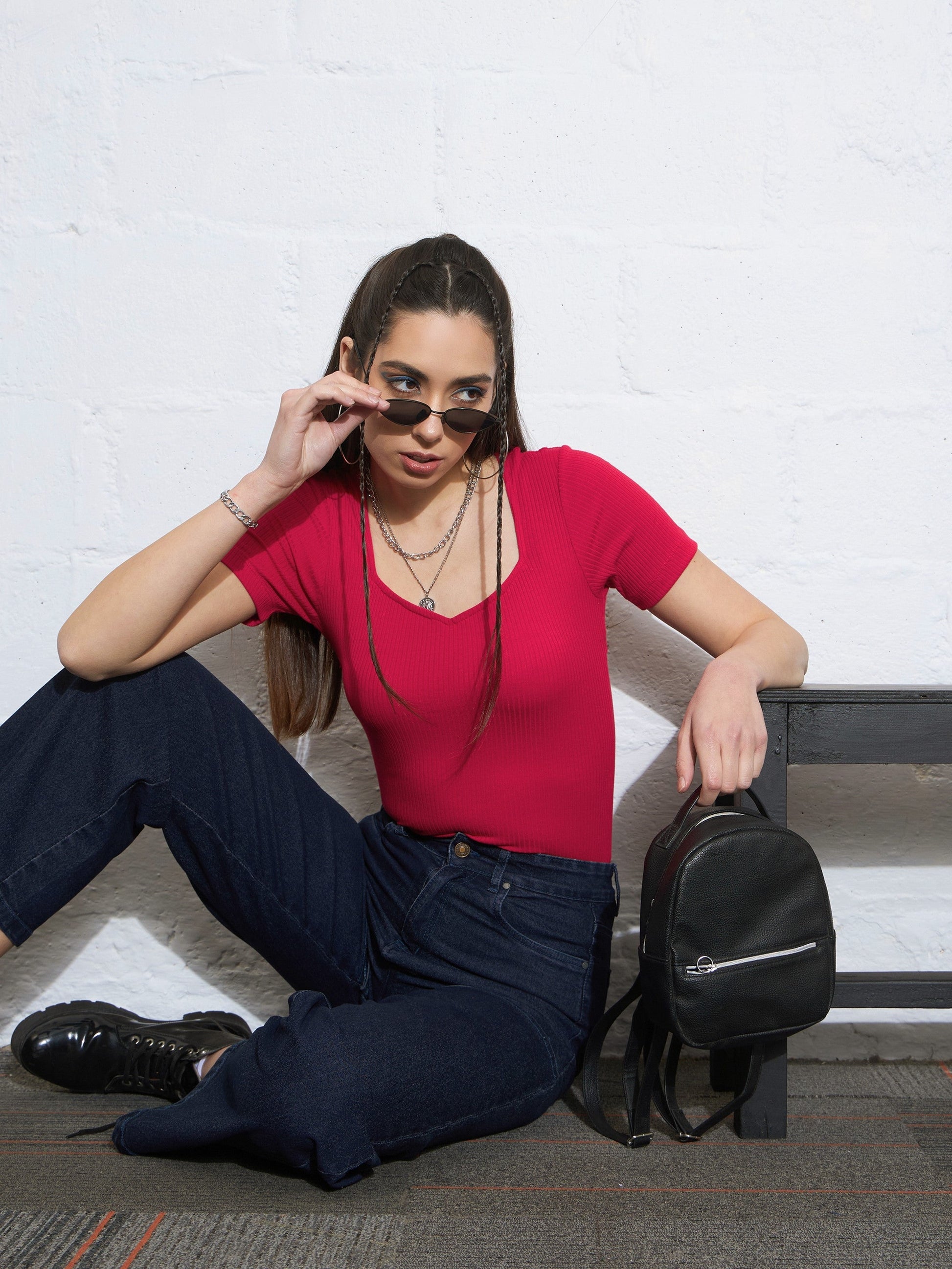 Red Rib Back Cut Out Top , in Rib fabric, Unlined, Regular Length , Slim Fit , No Closure, Straight Hemline and features Cut Out Detail At Back
